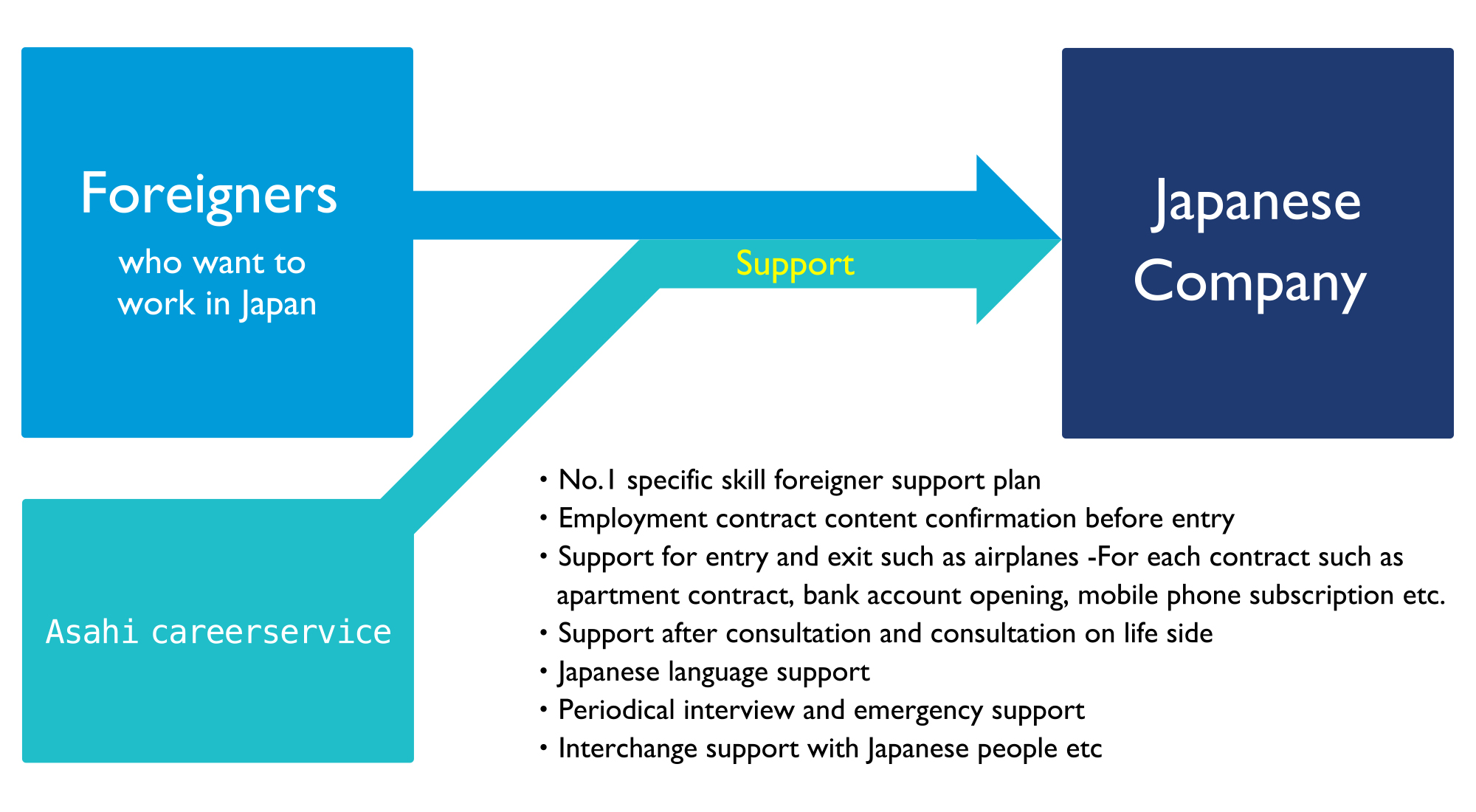 Asahi Career Service provides consistent support from acquisition procedure of status of residence "specific skills" to employment placement to Japanese companies. You have to meet the requirements of Japanese language ability and academic background, but please feel free to contact us first.